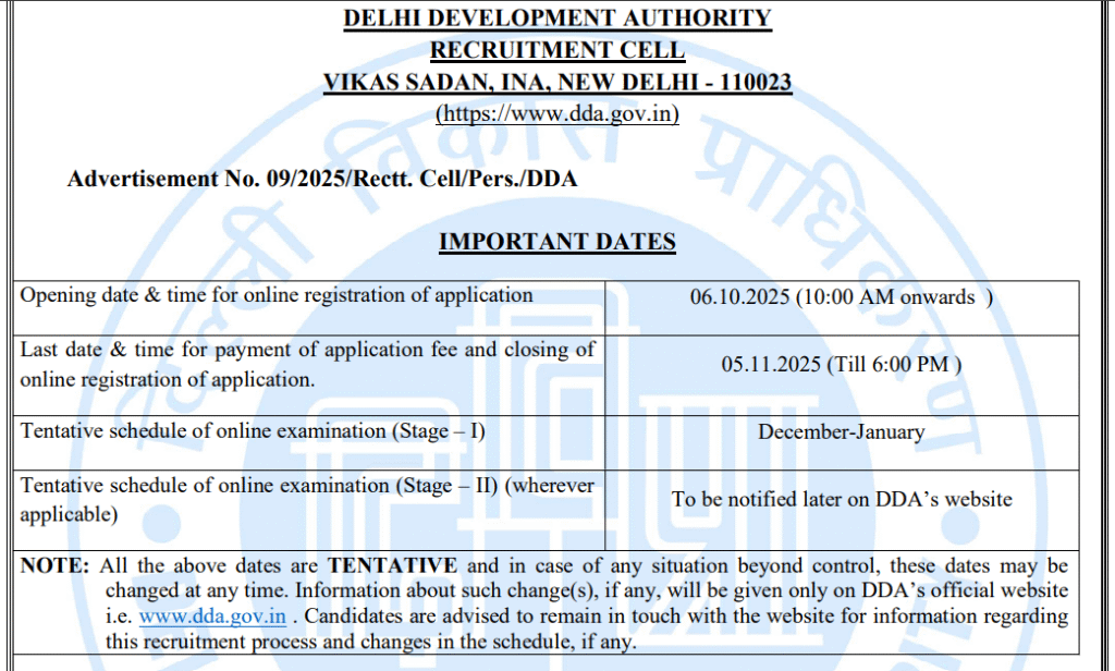 दिल्ली विकास प्राधिकरण की तरफ से आधिकारिक DDA वेबसाइट पर विज्ञापन 12 सितंबर 2025 (शॉर्ट नोटिस) और 26 सितंबर 2025 (फाइनल नोटिफिकेशन) को जारी हुआ था। इसके आवेदन फार्म 6 अक्टूबर 2025 से भरे जाने शुरू हो चुके हैं। आवेदन फार्म की अंतिम तिथि 5 नवंबर 2025 निर्धारित की गई है, वहीं आवेदन शुल्क के भुगतान की अंतिम तिथि भी 5 नवंबर 2025 निश्चित है। अगर आप दिल्ली में नौकरी करना चाहते हैं तो यह आपके लिए सुनहरा मौका होने जा रहा है।