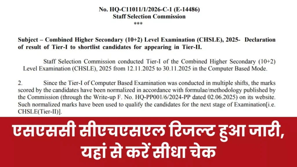 SSC CHSL Result 2026: कर्मचारी चयन आयोग की तरफ से Combined Higher Secondary (10+2) Level Examination 2025 यानी SSC CHSL 2025 Tier 1 का रिजल्ट जारी हो गया है। परीक्षा में भाग लेने वाले उम्मीदवार अपना परिणाम आधिकारिक वेबसाइट के माध्यम से डाउनलोड कर सकते हैं। एसएससी की तरफ से आयोजित होने वाली सीएचएसएल Tier-1 परीक्षा के रिजल्ट का इंतजार छात्रों को लंबे समय से था। आयोग की आधिकारिक वेबसाइट पर इसका विज्ञापन जारी हो चुका है।